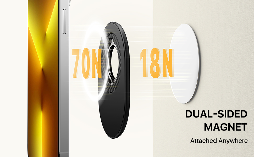 Lightweight ring holder with strong magnets: 70N on the front and 18N on the back, giving your phone maximum grip and stand practicality, 100% guarantee that your phone won't drop and fit perfectly to all magnetic objects. It is made of zinc alloy material, has built-in magnets, and acts as a strong connector between your phone and a magnetic car mount.